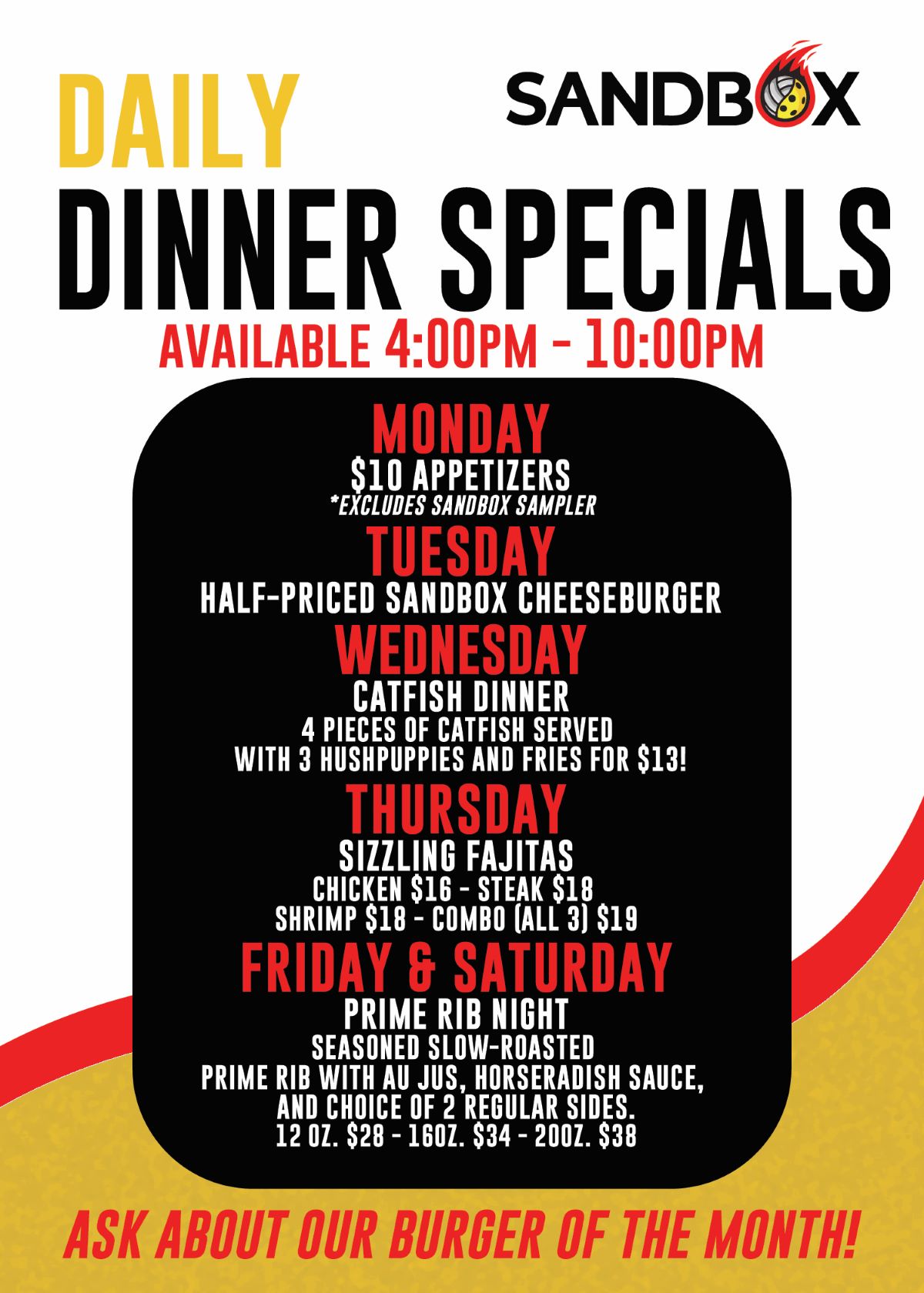 Daily deals on scratch-made favorites at Sandbox! Don’t miss out on these delicious dinner specials at Sandbox Monday-Saturday! Available starting at 4 pm.